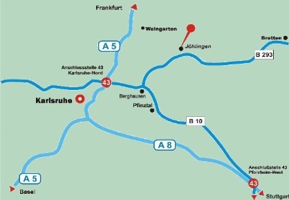 - von Süden und Westen über Ausfahrt Karlsruhe-Nord und Berghausen,